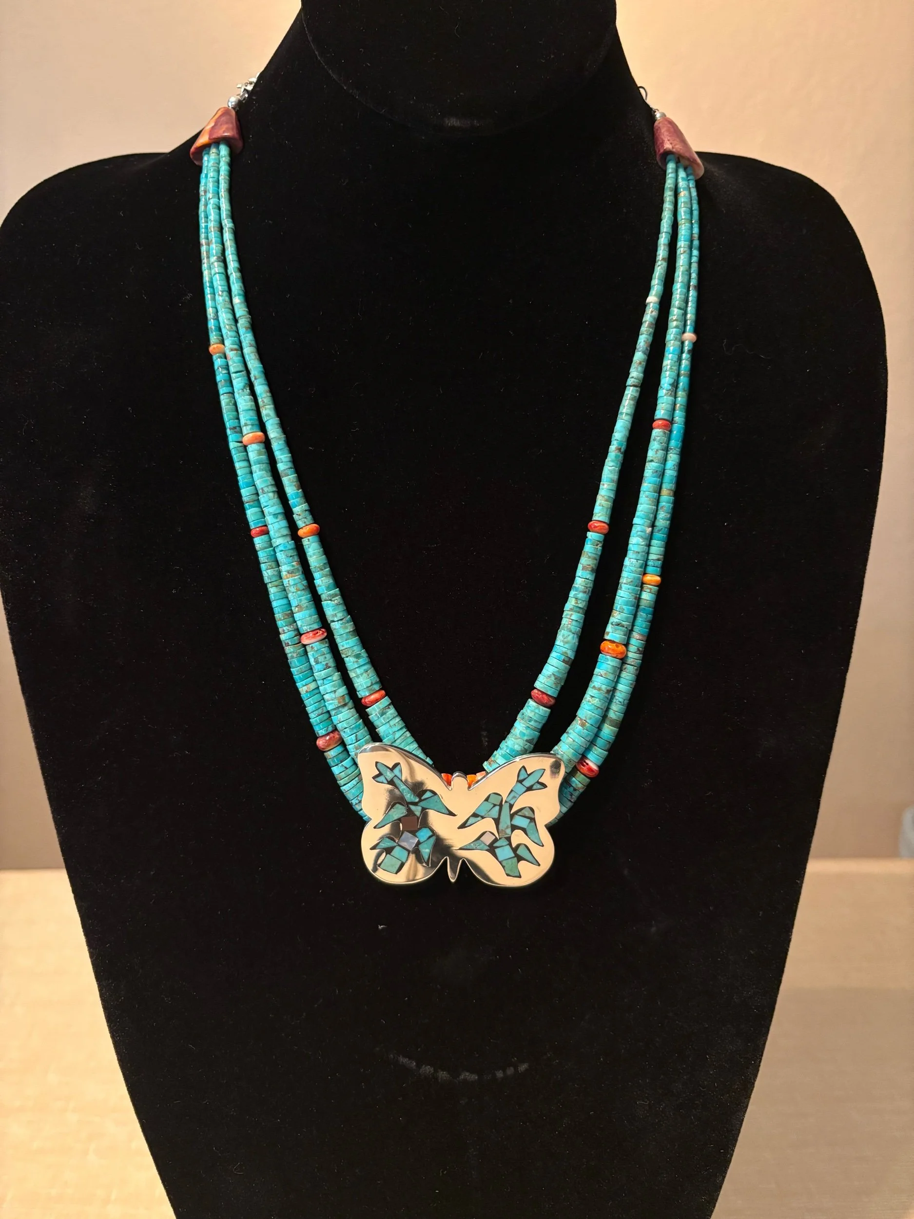 Three strands of natural kingman turquoise complimented with specks of spiny oyster beads with a sterling silver butterfly as a centerpiece. Centerpiece is crafted using an overlay technique with a 16 gauge top plate and soldered onto a 22 gauge backplate. Natural kingman turquoise and shells are inlaid into the channels that have a corn stalk silhouette on each wing. Total length is 20” and comes with an adjustable chain for universal fit.