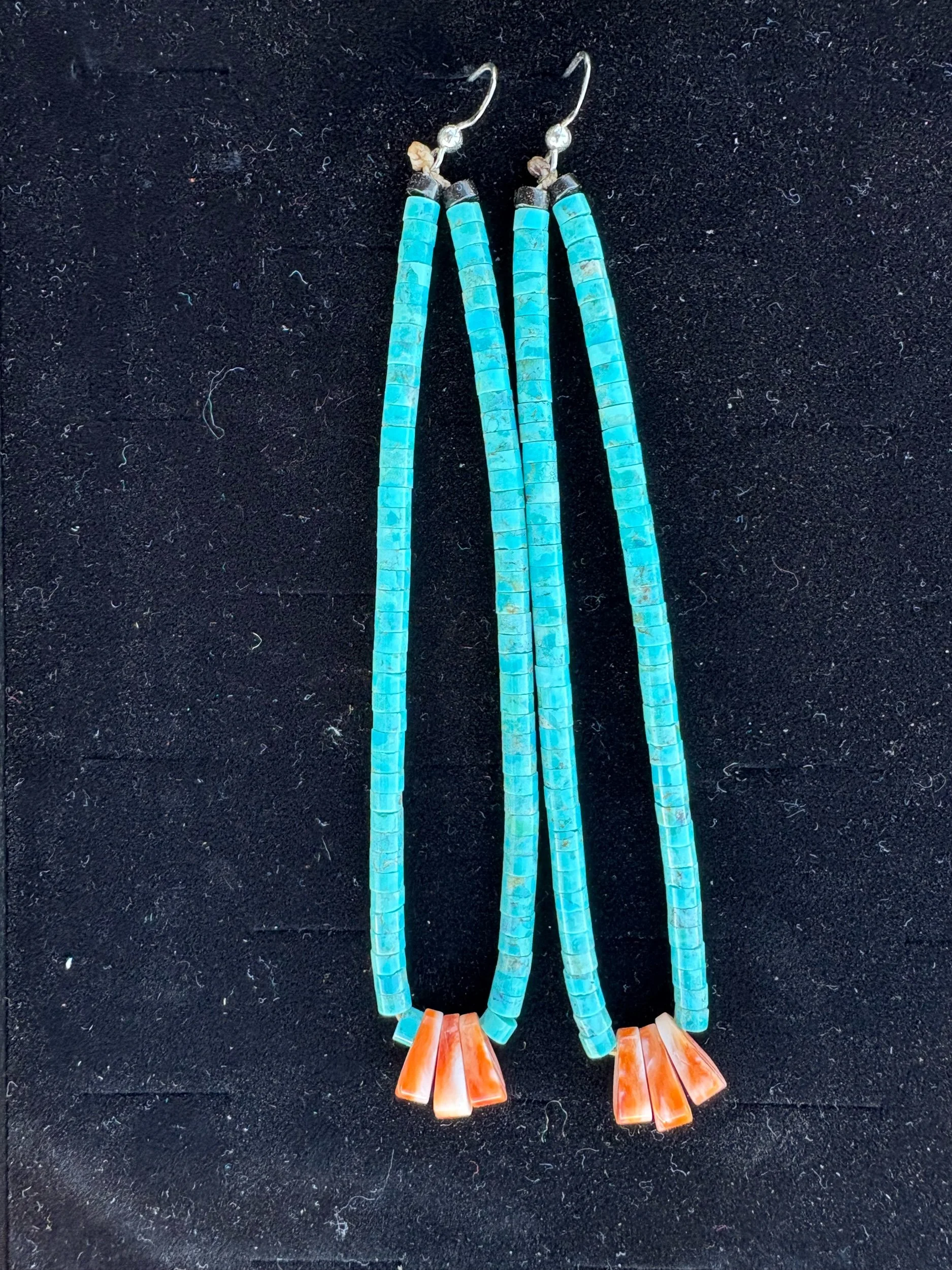 4” kingman heishi with spiny oyster centerpieces at the bottom. Finished off with blacker accents and sterling silver ear hooks.