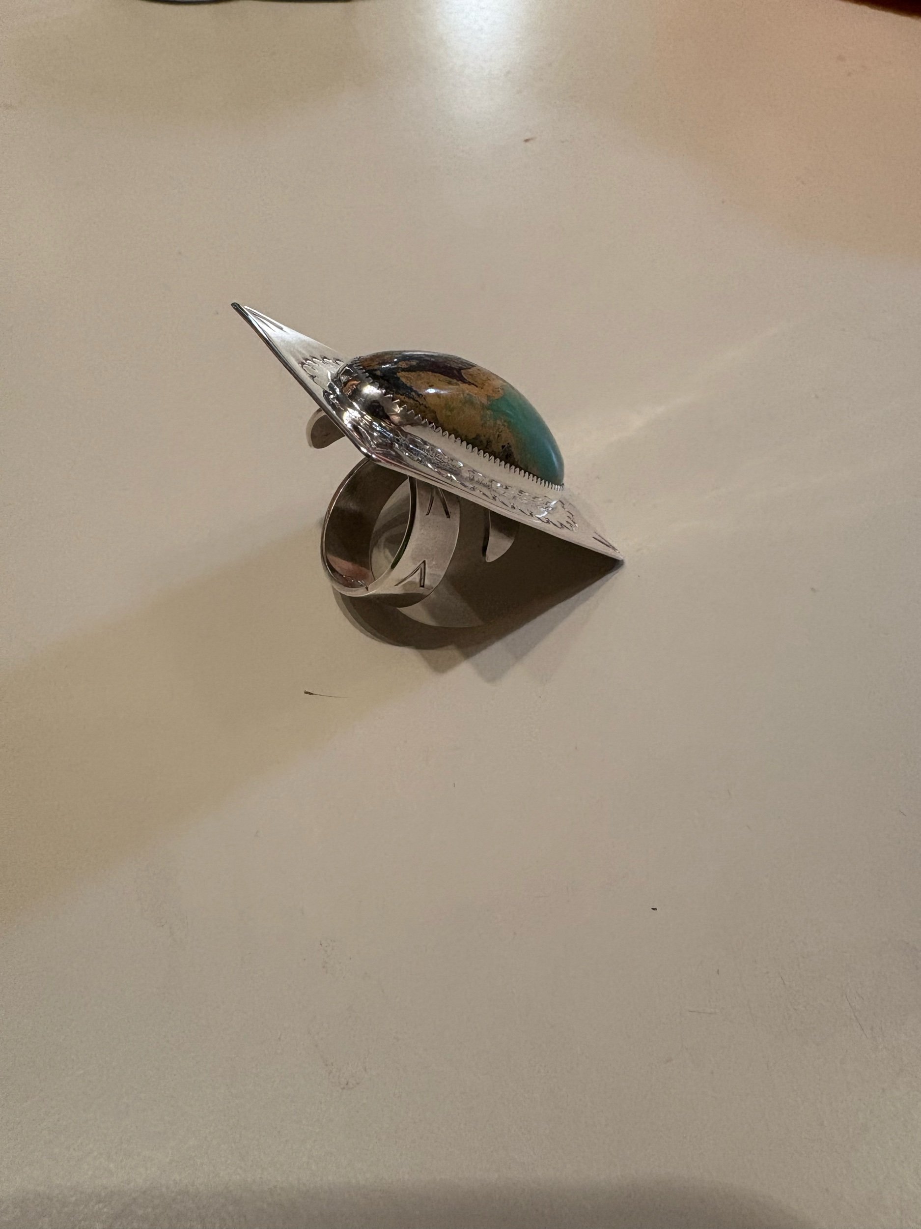 Shop › Elisa Turquoise Ring Image 1 of 4 Image 2 of 4 Image 3 of 4 Image 4 of 4 Elisa Turquoise Ring $250.00 Elisa turquoise statement ring. Crafted from sterling silver with a unique spiral ring band. Size 9 band Add To Cart Added! Elisa turquoise statement ring. Crafted from sterling silver with a unique spiral ring band. Size 9 band